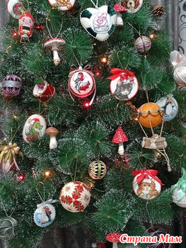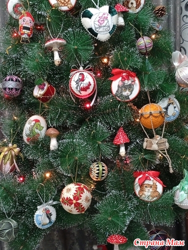 А это моя ёлка в этом году, там есть несколько таких шариков. А вообще все до единой игрушки ручная работа
