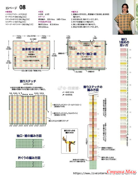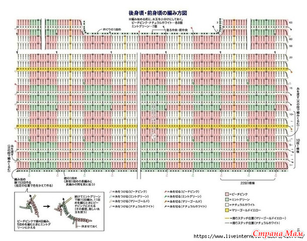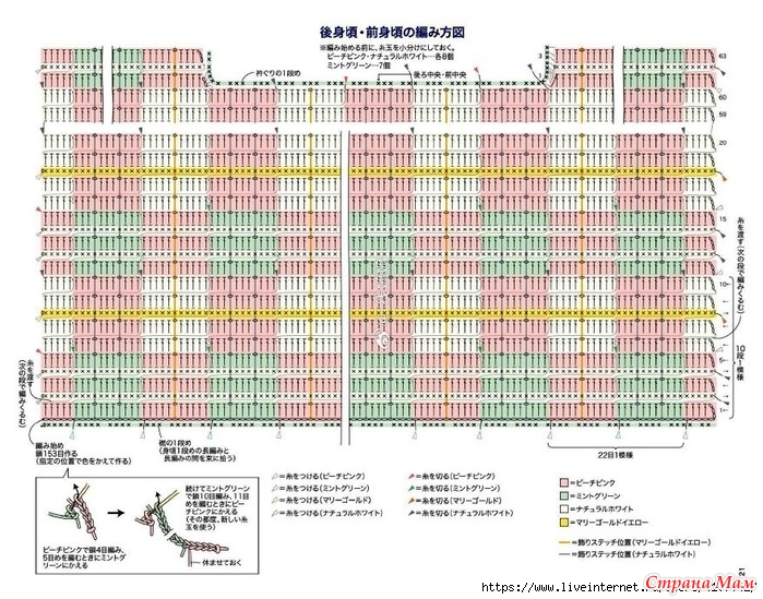 * Соединительные петли и воздушные петли провязываются в указанные места (см. схему узора) (вязание от подола к плечам).