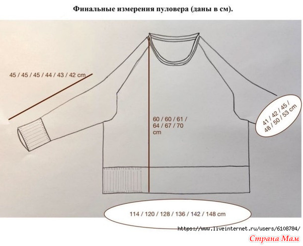Дизайн пуловера предполагает свободный бокси-силуэт. Рекомендованный припуск на свободу облегания — примерно 20 см. Для больших размеров лучше заложить чуть меньший припуск на свободу облегания.