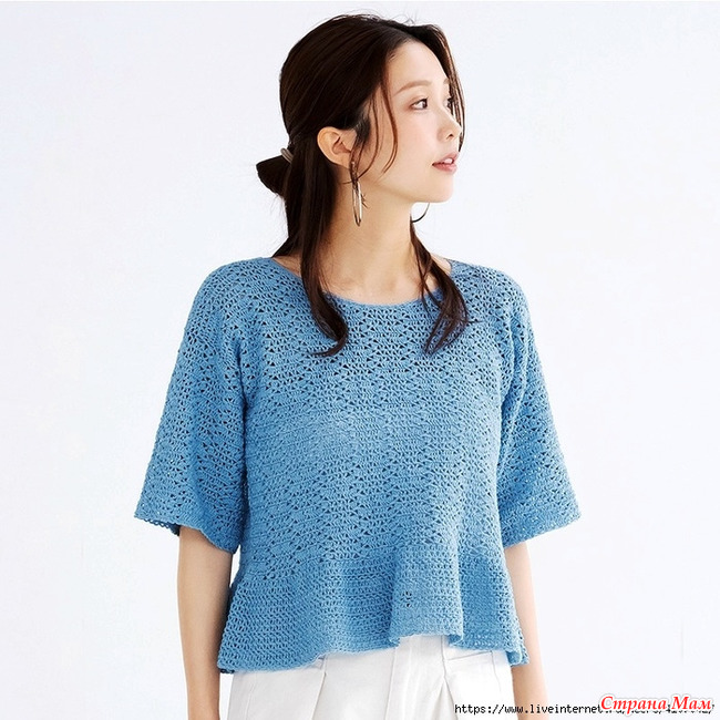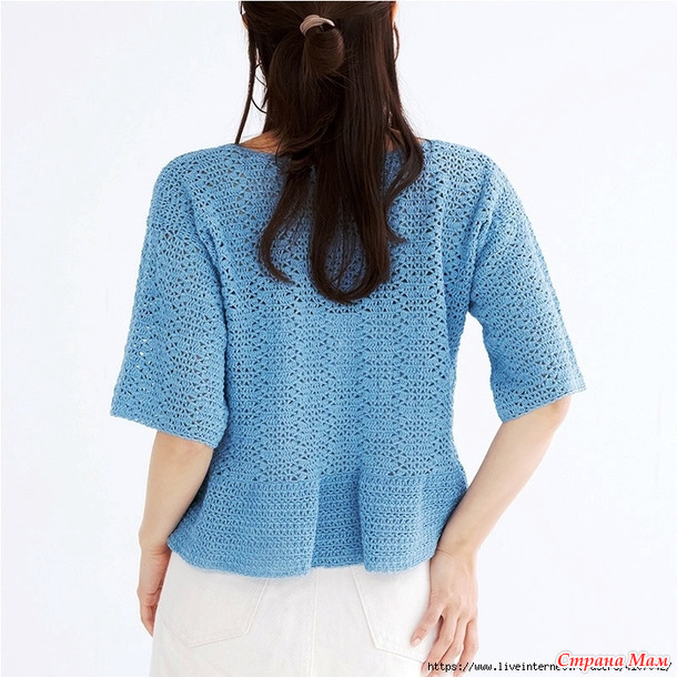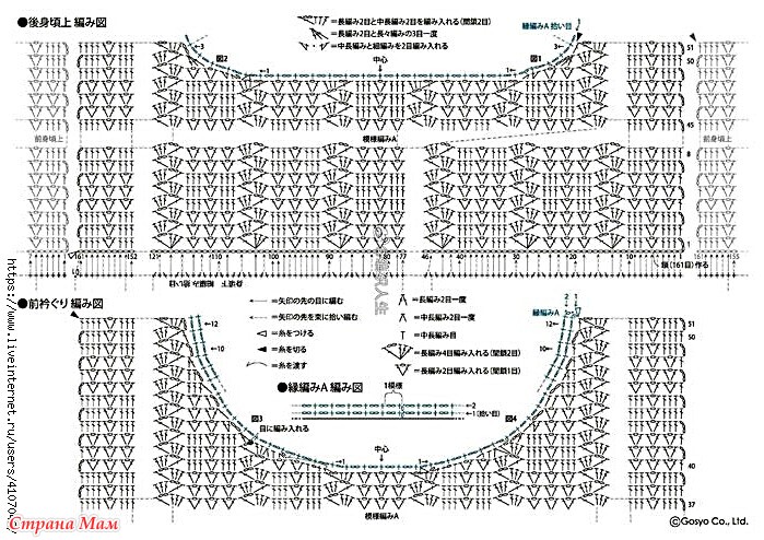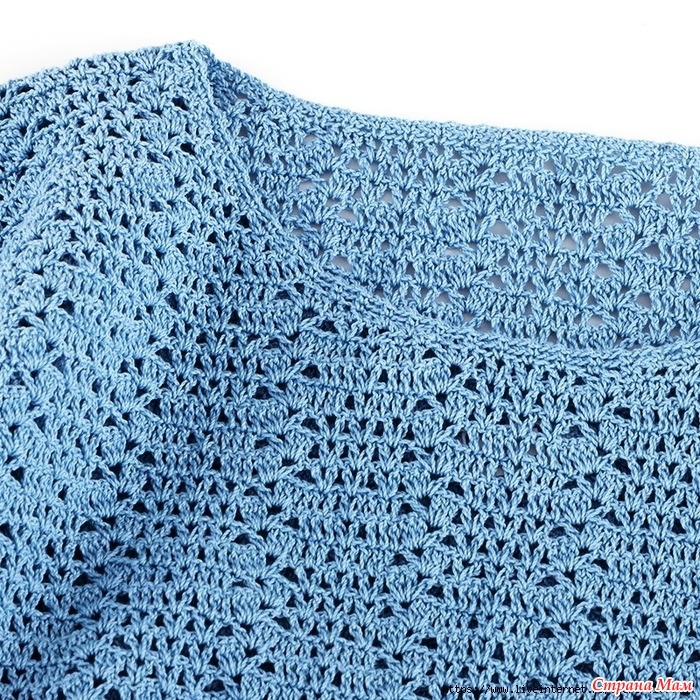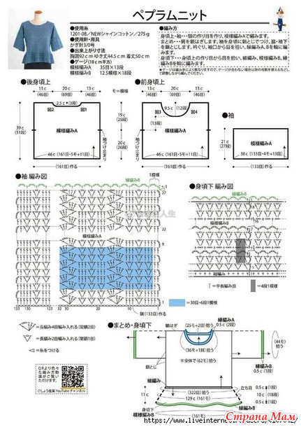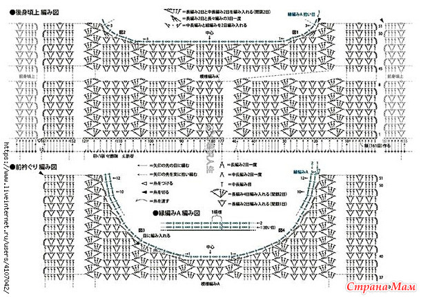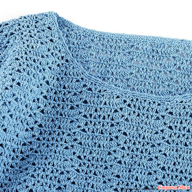 Краткое описание... Свяжите плечи цепочкой. Пришейте рукава к лифу цепочкой, а также боковые части и проймы цепочкой. Наберите петли с выреза горловины и манжет и провяжите кайму А и В по кругу.