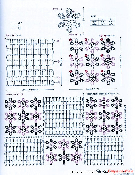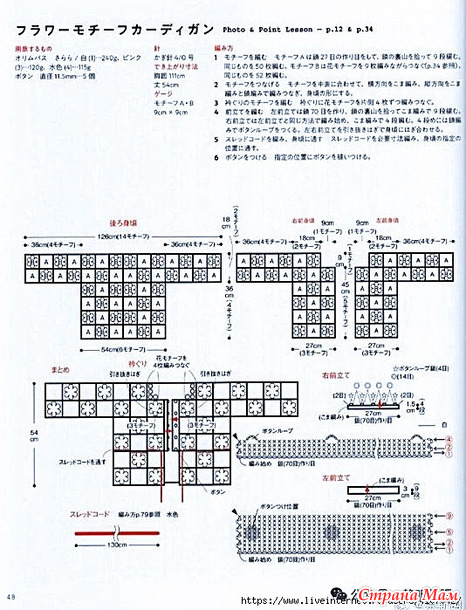 1. Вязание мотивов. Начните с начальной цепочки из 27 воздушных петель и провяжите 9 рядов, набирая петли с затылка. Провяжите 50 таких рядов. Соедините мотивы, провязав вместе несколько цветочных мотивов (см. стр. 34). Провяжите 52 таких мотива.
