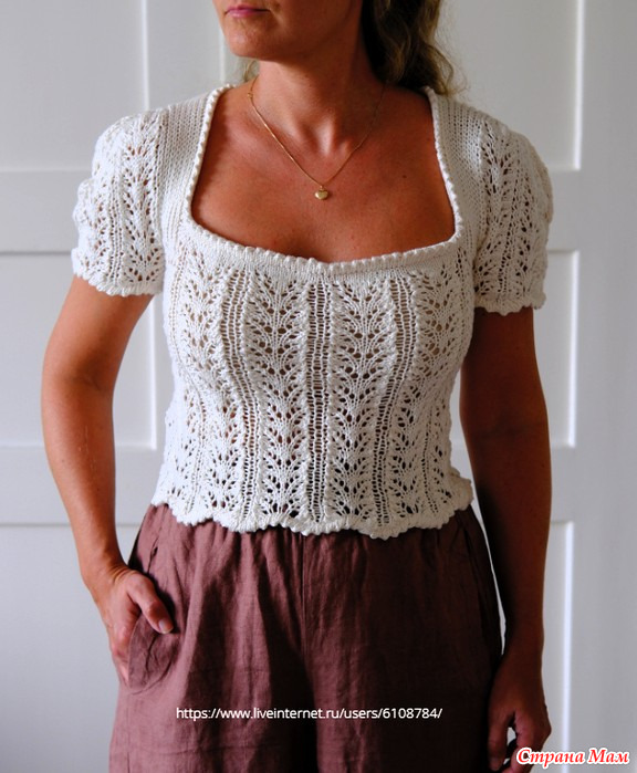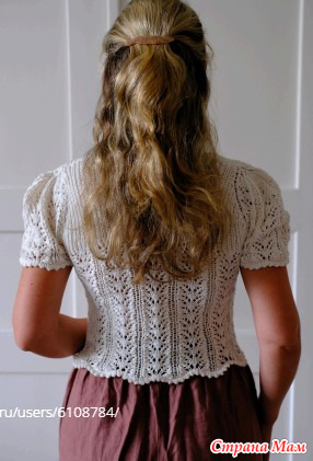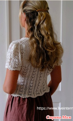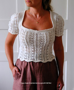 Футболка Nostalgia вяжется снизу вверх, начиная с основной части. Затем вяжутся рукава, которые соединяются для выполнения кокетки. Наконец, вырез горловины обрабатывается красивой фестончатой отделкой.