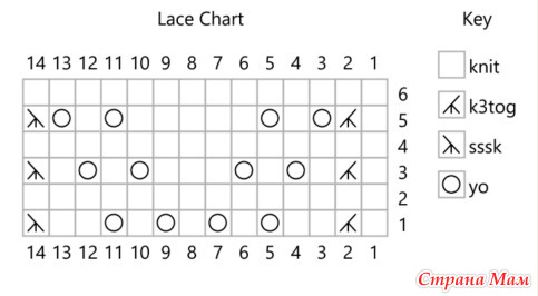 Sssk slip 3 sts kwise to RH needle, slip back to LH needle, k2tog tbl (2 sts decreased) - переснять 3 петли как лицевые на правую спицу, переснять их обратно на левую спицу, провязать 2 вместе с наклоном влево провязанными изнаночными (уменьшено 2 петли)