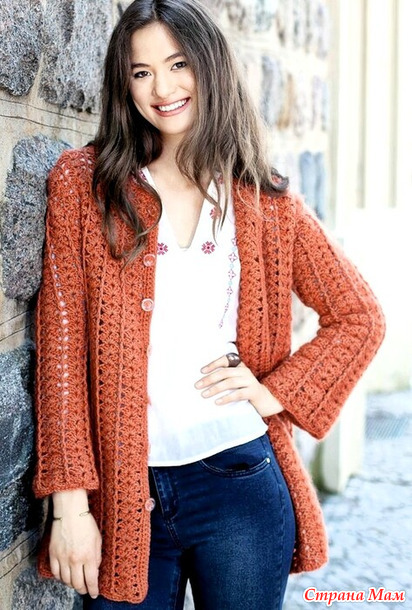 Для вязания нам потребуется 650 (700) 750 г кирпичной пряжи 1: 60% натуральная шерсть, 40% полиакрил; 120 м/50 г.