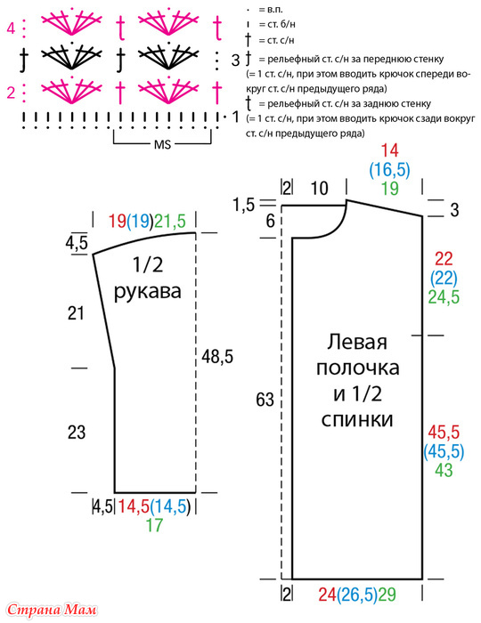 Через 67,5 см = 44 ряда от начального ряда пропустить для плечевого скоса с обеих сторон 1 (1) 1,5 раппорта и в следующем ряду еще раз пропустить 1 (1) 1,5 раппорта.