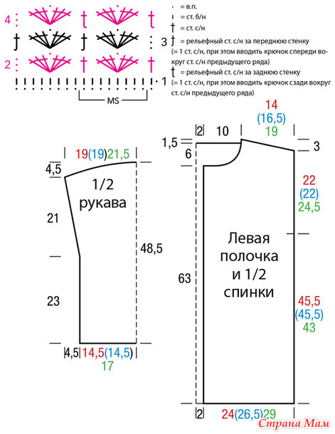 Левая полочка. Выполнить цепочку из 41 (45) 49 в.п. + 1 в.п. подъема и вязать основным узором, при этом для 2-го размера начать с 5 ст. с/н, затем выполнить раппорт 5 раз.