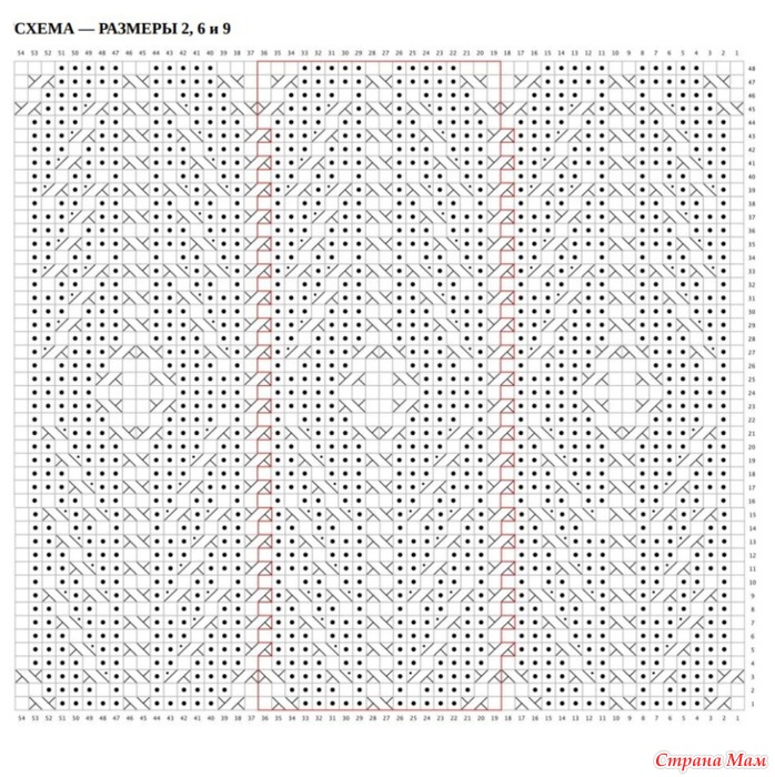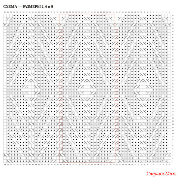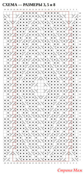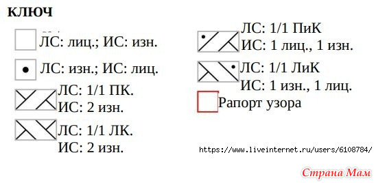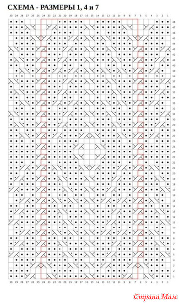 Установочный Ряд (ЛС) : начиная с 39-го ряда, Столбец 1 схемы, которая соответствует вашему размеру, вязать все п. по узору, но провязывая 1/1 ПиК и 1/1 ЛиК просто как 2 изн. без косы.