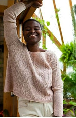 Арановый узор, полностью покрывающий переднюю часть, очень деликатен - это очень простая система с косами только на двух петлях, которую можно вязать без дополнительной спицы (спицы для кос). Арановый узор прост и легко запоминается, и он очень увлекает. Прямая линия Йоки и форма спадающих плеч делают свитер неподвластным времени и очень удобным базовым.