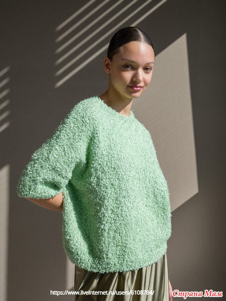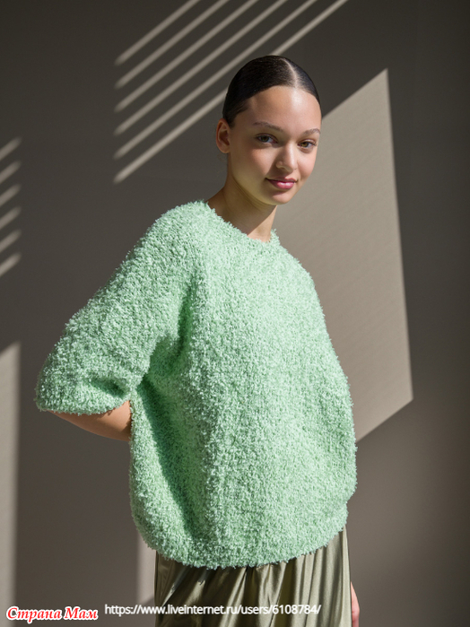 Пряжа: Lana Grossa Frizzante (54% хлопок, 46% полиамид, длина нити 105 м / 50 г). Расход: 400 (450 – 500 – 550) г весенне-зелёного (цв. 9)