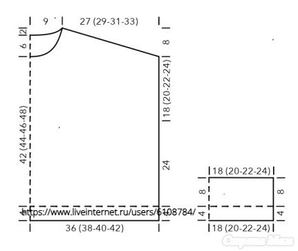 На высоте 18 (20 – 22 – 24) см от начала пройм закрыть для плеч с обеих сторон в каждом 2-м ряду: 9 (6 – 3 – 0) раз по 5 п. и 0 (3 – 6 – 9) раз по 6 п.