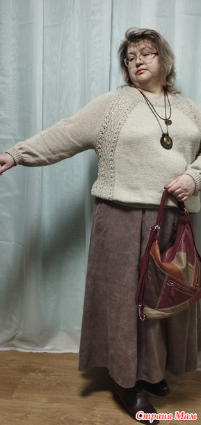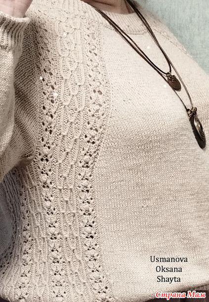 Всем рукодельный привет! Спешу предствить джемперок " Стёжки-дорожки",который связан из бобинной гребенной пряжи бренда E.Miroglio арт.Австралия, 1400м-100г, (меринос-50%, акрил-50%) в три нити и в тон - одна нить хлопка с микропайетками, спицы №2,75 - резинка, основное полотно - спицы №3,25. Вес изделия - 560гр.