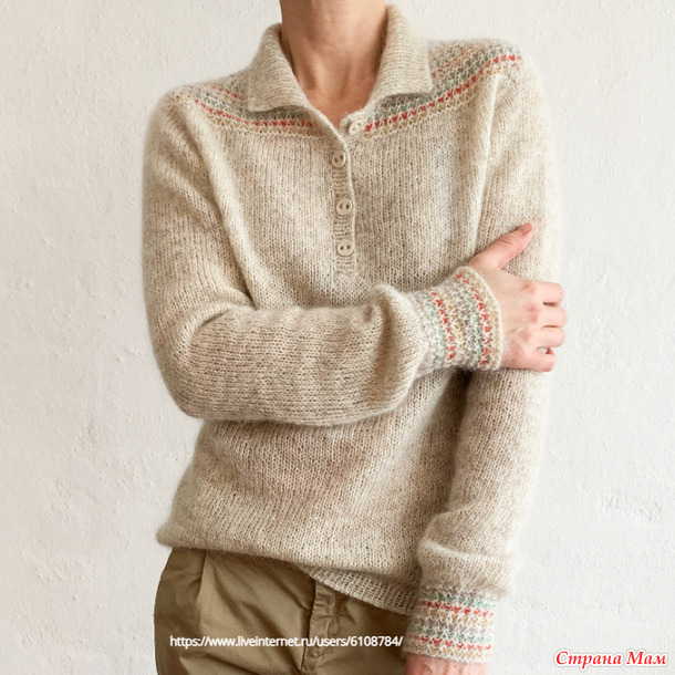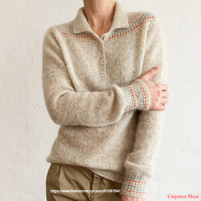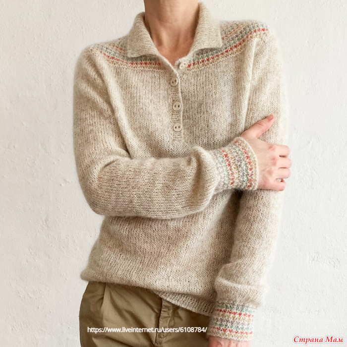 Tove — элегантная блуза-рубашка с мозаичным вязанием на кокетке и манжетах. Дизайн создан как часть коллекции Isager Archives и является переосмыслением модели из архивов 60– 70-х годов — именно оттуда взято вдохновение для мозаичного узора.