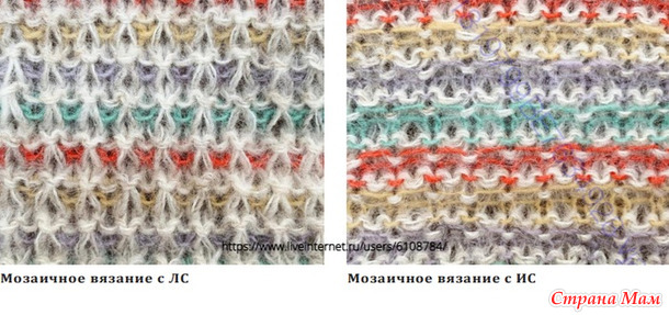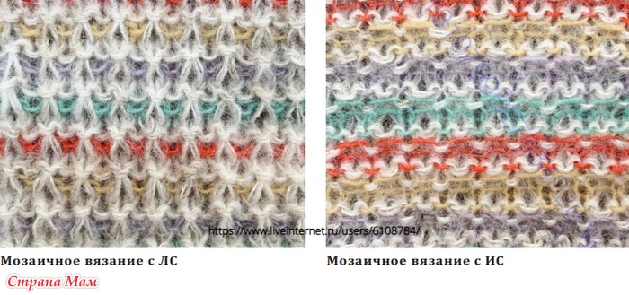 Теперь выполнять мозаичное вязание на кокетке. Два ряда выполняются, чередуя нить A и B.