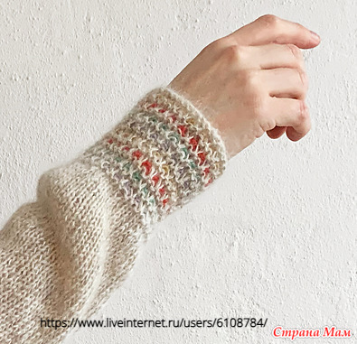 Убрать М НКР. Вязать лиц. п. до первого М по внутреннему краю рукава. Это теперь НКР. Убрать второй М.