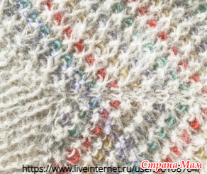 Провязать оставшуюся часть ряда на ЛС по рисунку. Обе стенки двойной петли провязывать вместе лицевой как 1 петлю.