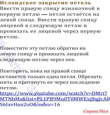 Провязать ряды 1.–2. ещё один раз и закрыть петли исландским способом