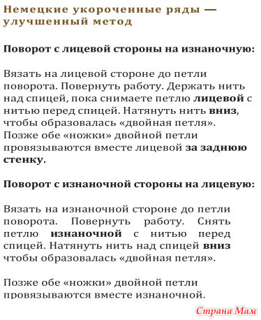 Окат рукава формируется укороченными рядами. Используется улучшенный метод немецких укороченных рядов (см. справа).