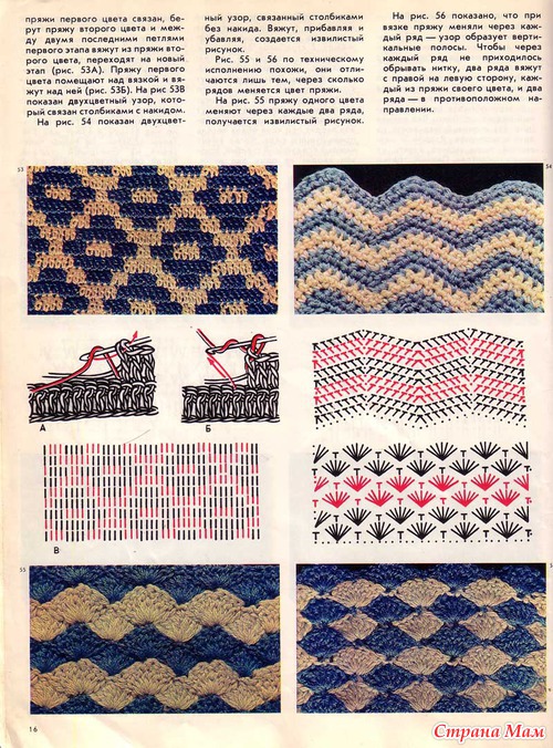 Набрать 6 в. п. и замкнуть в кольцо, во 2 р. связать 12 ст. с. н., далее вязать прибавляя в каждом ряду равномерно 6 п. связать донышко диаметром 15 см, затем вяхать по схеме рис. 55-56