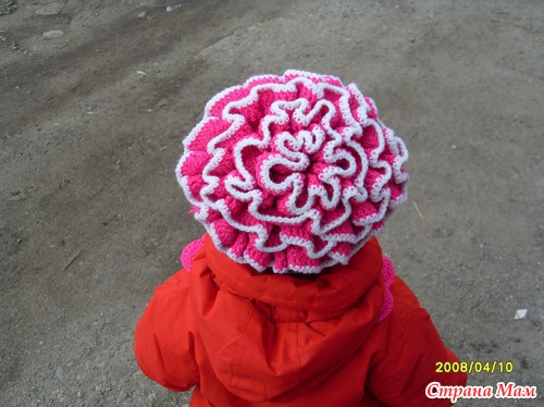 помпон:прицепиться в донышко шапки в 1-2 см. от центра набрать 6 в. п. подъема и вязать вееры столбиками с накидом покругу. После каждого веера вязание поворачивать и отступать 2 петли донышка. 1 ряд веер, 2, 3 ряды ст. с. н. Связать 3-4 круга помпона.