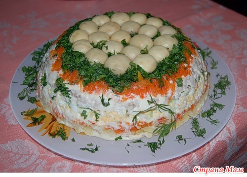 Поставить салат на 2 ч в холодильник. Затем перевернуть грибочками вверх.