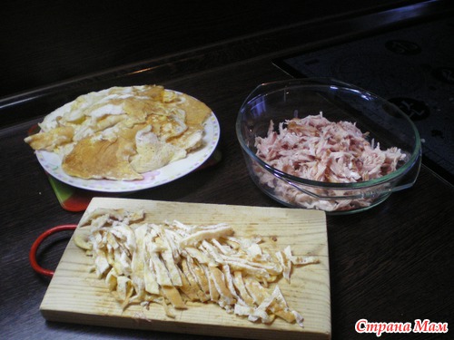 Лук мелко крошим лук. Яйца соломкой все смешиваем и заправляем майонезом. Все!!!