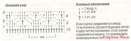 1-й ряд (круговой): * 1 столбик без накида, 3 воздушные петли, 1 столбик без накида в первый столбик без накида, пропустить 2 петли основания, повторять от *