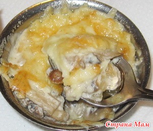 ЭТОТ ЖЮЛЬЕН ГОТОВИТСЯ ПРОСТО ИЗ КУРИЦЫ БЕЗ ГРИБОВ: 400 г куриного мяса, 30 г муки, 1 стакан сливок, 2 столовые ложки сливочного масла, 1/2 стакана сметаны, 1 столовая ложка тертого сыра, соль по вкусу.