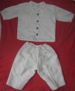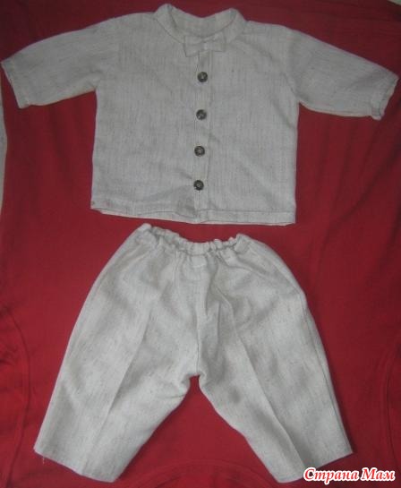 Я поверила в свои силы. Купила материал. Льняной (очень нравятся такие костюмы). Пуговки нарыла дома. Померяла своего карапуза. Провозилась почти неделю. Вот что вышло: