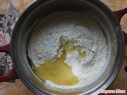 Заливаем кипяток тонкой струйкой и постоянно помешиваем. И получится тесто без комочков, но я поторопилась и поэтому они все-таки были.