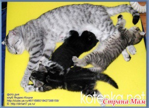 Сами роды начинаются со схваток, во время которых открывается шейка матки, котята становятся в определенном порядке и принимают определенную позу, готовясь к выходу на свет. Отходят воды и через определенное время начинаются потуги. Котенок идет обычно в пузыре, за ним следует плацента( послед). Если кошка не перегрызла пуповину, перережьте её продезинфицироваными ножницами, срез обработайте йодом. Если котенок родился, а пузырь не лопнул, разорвите пузырь над носиком, возьмите котенка в руку, прижав головку указательным пальцем, встряхните как градусник. Если малыш не подает признаков жизни или при дыхании изо рта появляются пузыри, то удалите жидкость из дыхательных путей( это удобно делать детской маленькой резиновой грушей с резиновым наконечником), интенсивно но аккуратно разотрите малыша полотенцем, и встряхните еще раз. Потом подложите котенка кошке, пусть она вылижет его. Когда на подходе будет следущий котенок, отложите малыша в соторону (в коробочку с грелкой), чтобы кошка не наступила на него. Обязательно считайте количество вышедших плацент. Все плаценты должны выйти в течении 12 часов после окончания родов.Если этого не произошло - срочно обращайтесь к ветеринару. Если котенок застрял, возьмите тряпочку, дождитесь потуги, и, обхватив тельце тряпочкой, аккуратно тяните в низ раскачивая из стороны в сторону. За конечности тянуть нельзя, только за шкурку. Если появилась голова, а тельце застряло, слегка потяните котенка за шкирку. Когда кошка нервничает или испытывает боль, она может убежать из родильной коробки или начать кусаться. Этого допускать нельзя, потому что может пострадать котенок или сама кошка. Разговаривайте с кошкой, подбадривайте ее в процессе родов, ваше участие успокоит ее и придаст ей сил. Если схватки, а потом потуги начались, отошли воды, а котята не появляются или родился только один котенок, а остальные никак не выходят, при этом потуги не прекращаются в течении многих часов, вам необходимо обратится к ветеринару. В перерывах между потугами покормите кошку, это придаст ей сил. Кошки после рождения котенка, как правило сьедают последы. Это вполне физиологично, но не давайте ей сьесть более двух плацент.