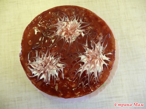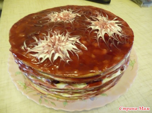 В этом тортике я использовала сметанный крем и вишни. Сверху торт залила густым киселем,