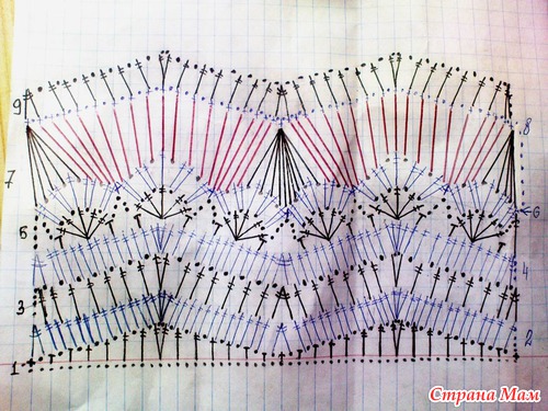 Нашла я схему по которой вязала, Там где длинные красные палочки-это столбик с 7-ю накидами, кто хочет длиньше может сделать и больше накидо. Учтите что число петель подъема в начале ряда, следует делать на 3 п меньше чем у вас будет накидов в столбике!!!