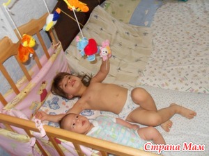 Недавно перестилала я пеленку в пеленаторе и на это время положила Олежку (3 мес) в кроватку. А Катюша (2 года 2 мес), конечно, к нему там присоединилась. И вот чисто случайно я краем уха подслушала, о чем она ему увлеченно рассказывала, а он зачарованно слушал."Это один ванянь, это два ванянь, это тьи ванянь..."
