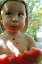 Вот так мы первый раз пробовали арбузик. Испытывали кучу различных эмоций. Пока мама бегала вокруг, щелкая фотоаппаратом.