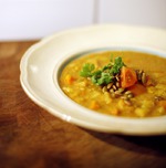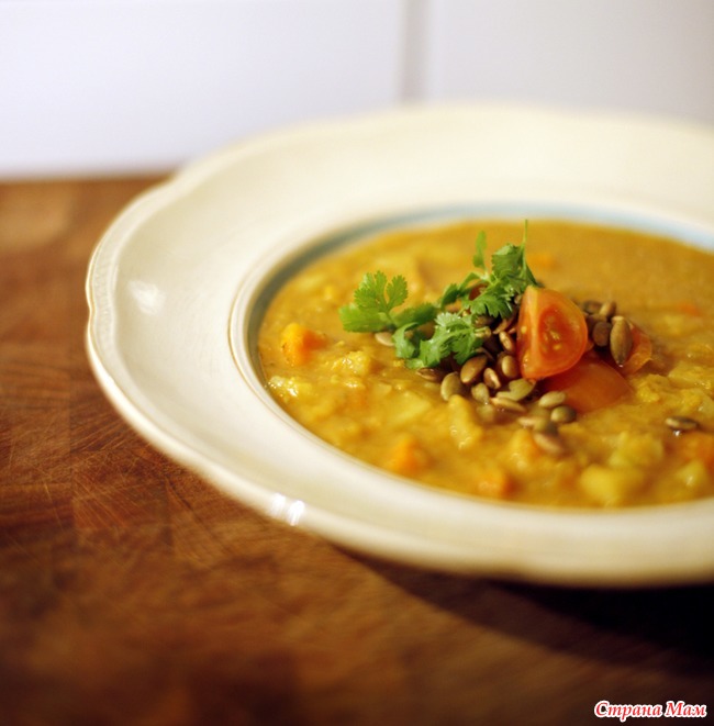 Суп разлить по тарелкам, добавить кусочки курицы.