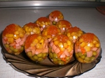 Начинку порезать кубиками ( начинку соберете по своему вкусу) и заполнить все свободное пространство яичной скорлупы до верха и залить бульоном с растворенным в нем желатином.