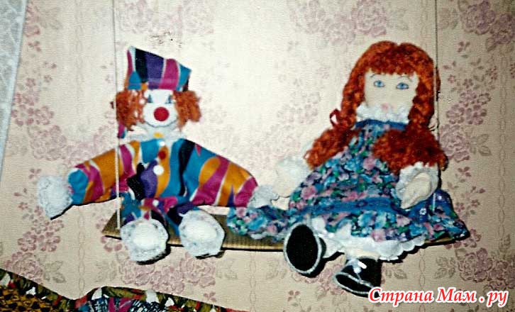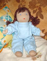 Кукла сшита из шерстяного трикотажа. Волосы - шерстяные нитки. Одежка - ворсованный х/б трикотаж. Набита натуральной шерстью и синтепоном (надо целиком шерстью, но ее не хватило).
