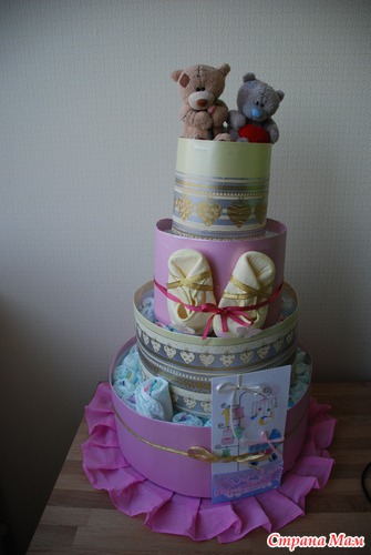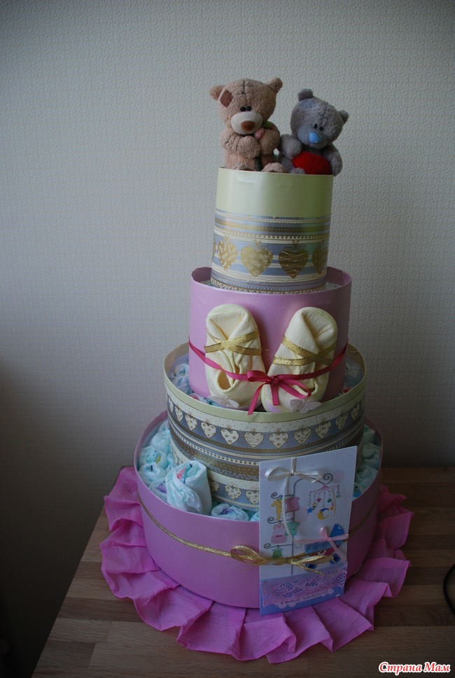Давным-давно, а на самом деле около месяца назад подарили друзья нам с Добрусей большущий торт. Да не обычный, а памперсный. вот такой. В него еще были встроены открытка, бодик-платье и туфельки. Весьма симпатичное сооружение, и делается не так уж сложно: в картон, степлер, канцелярские маленькие резиночки, тонкие палочки, оберточная бумага и собственно памперсы 1 и 2 размеров.