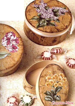 Основа, на которой выполнен декупаж на этих маленьких круглых и овальных коробочках из легкого бальзового дерева, создана путем ’наклеивания маленьких рваных кусочков тонкой рисовой или банановой бумаги