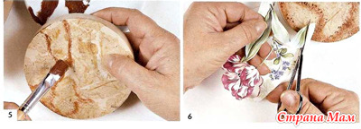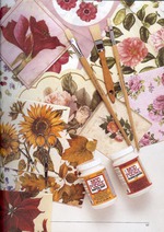 6. Аккуратно наклейте вырезанный элемент центру коробочек при помощи водного раствора акрилового клея в соотношении 2:3. При вырезании и наклеивании аппликации всегда немного отличаются от рисунка, который был на бумаге. Например, на одной коробочке до¬бавлены желтые цветы, а на другой укорочена ножка тюльпана, чтобы он лучше поместился в центре. Эти небольшие исправления очень важ¬ны, поскольку рисунок на бумаге не всегда иде¬ально подходит к выбранной поверхности.