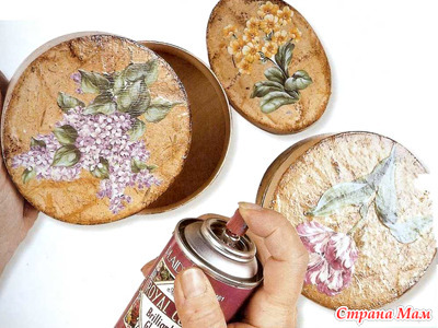 7. Отделка выполнена глянцевым лаком, нанесенным при помощи кисточки по краям коробочки. Крышки покрыты отделочным лаком - спреем, который ложится ровнее и быстрее сохнет. Ленточки приклеены распыляемым жидким клеем