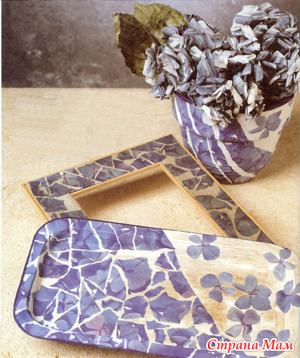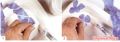 1. Нанесите на поднос слой белой акриловой краски и «состарьте» при помощи сильно раз-бавленной акриловой краски с «сиенской зем¬лей». Наклейте плоские бумажные голубые гор-тензии только на ¾ части подноса. Разорвите бумагу руками на продольные полоски, наклей¬те их в порядке отрывания.