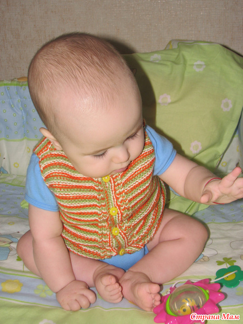 , я была уверенна что буду ему почти каждую неделю вязать что-то новенькое. Результатом моей мечты есть эта жилеточка, которую я наконец связала, а сынуле уже 6,5 мес