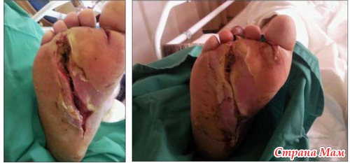 Ниже приведена фоторафия человека, который наступил на разбитую лампу 10 февраля 2011 года и получил заражение тканей стопы ртутью.