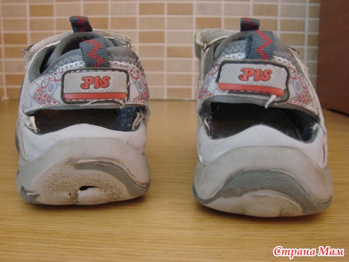 Купила сынуле обувь спортивную на теплый период. Только одел он ее всего 3 раза, и все благодаря самокату, вместо того чтобы использовать его по назначению, то есть стоять и одной ногой откалкиватся, он садится и скатывается с горки, а ноги это своебобразный тормоз, горка была довольно крутая и тормоза работали на всю катушку и обновка превратилась вот во что: