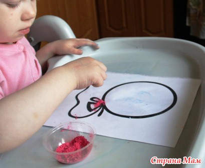 Детка сначала пыталась брать щепоткой, но потом сделала проще - сыпанула всю емкость на картинку...