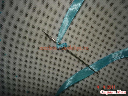 Протыкаем ленту иглой в том районе, где у вас будет верхушка бутона и выводим иглу с лентой на изнанку