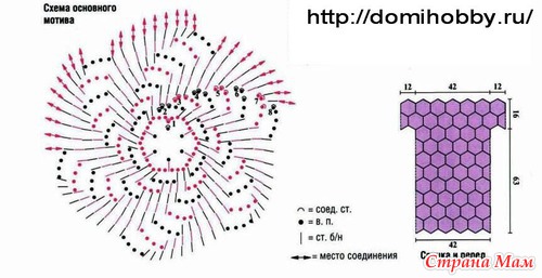 Готовые мотивы соединить между собой в последнем ряду согласно схеме и выкройке. Линию горловины, линии пройм и низ платья обвязать по кругу следующим образом: 1-й ряд: ст. б/н. Ряд закончить соед. ст.: 2-й ряд: «Рачий шаг». Ряд закончить соед. ст.