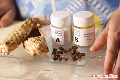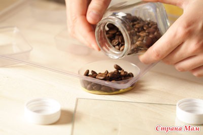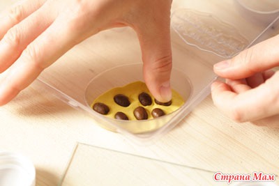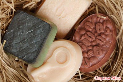 Итак, для примера возьмем сувенирные лапти и кофейные зерна. Тут вы можете заметить, что кофейными зернами и так можно посыпать мыло, и не заморачиваться с "фактурными вкладышами". И я с вами соглашусь, но при условии, что ваша ванна не склонна к засорам. Иначе выковыривание зерен из стока вам обеспечено.