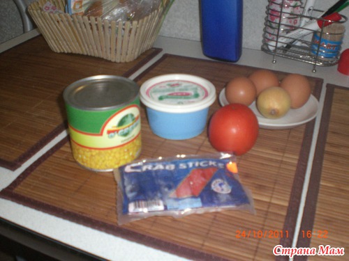 Рецепт этого салата я уже знаю давненько и готовила не раз на всевозможные праздники. Блюдо легкое, быстрое и недорогое. Нам понадобится 2 помидора среднего размера, 3 вареных яйца, 1 банка кукурузы,1 маленькая луковичка, 1 упаковка крабовых палочек (100 г), майонез, соль по вкусу.